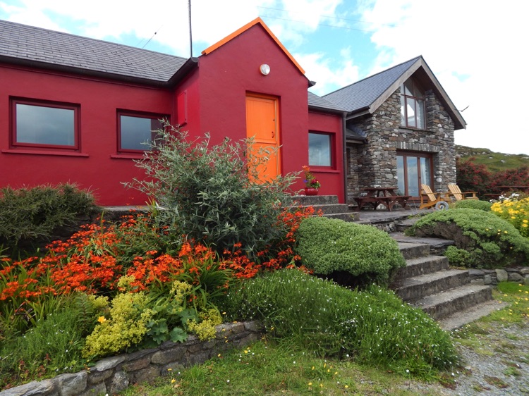 Eine Tür führt auf einen kleinen Balkon der übergeht in eine Natursteintreppe zwischen Fuchsien hinunter zur Terasse.